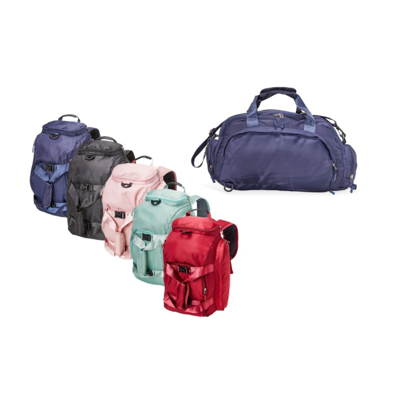 Bolsa esportiva de 33 litros em poliéster impermeável com cinco compartimentos, sendo três deles para tênis, itens molhados e armazenamento das alças de costas. Com alça transversal removível e alça de mãos, a bolsa contém alças de compensação e alças para as costas ocultas no compartimento inferior, podendo ser transportada como mochila.