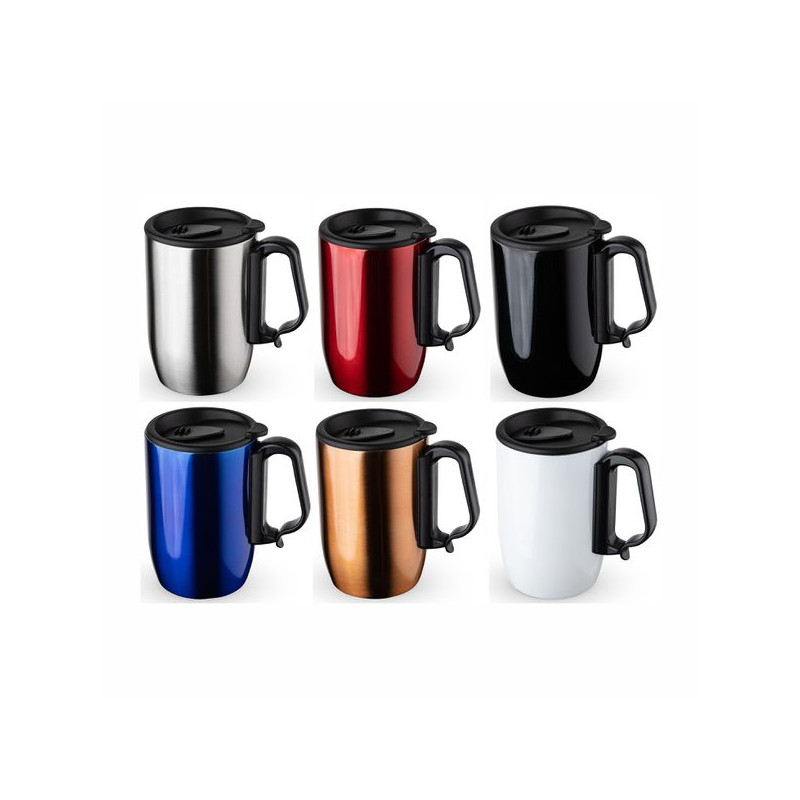 Caneca 350ml parede dupla em Inox, com pegador de plástico, contém tampa com compartimento que ao deslizar, pode ser aberto para beber e base com EVA antiderrapante.