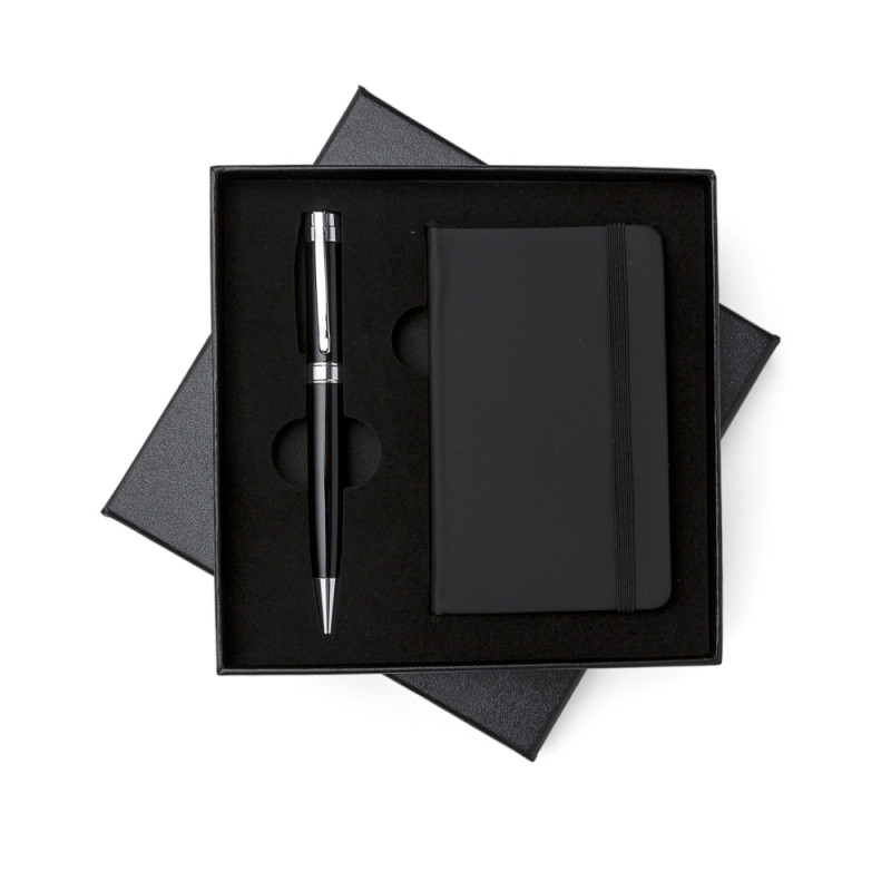 Kit executivo 2 peças em estojo de papelão com tampa e parte interna revestida de espuma. Contém: caneta metal preta com anel, detalhes em prata e escrita preta; caderneta emborrachada com aproximadamente 80 folhas amarelas com pauta. Acompanha placa metálica para gravação.