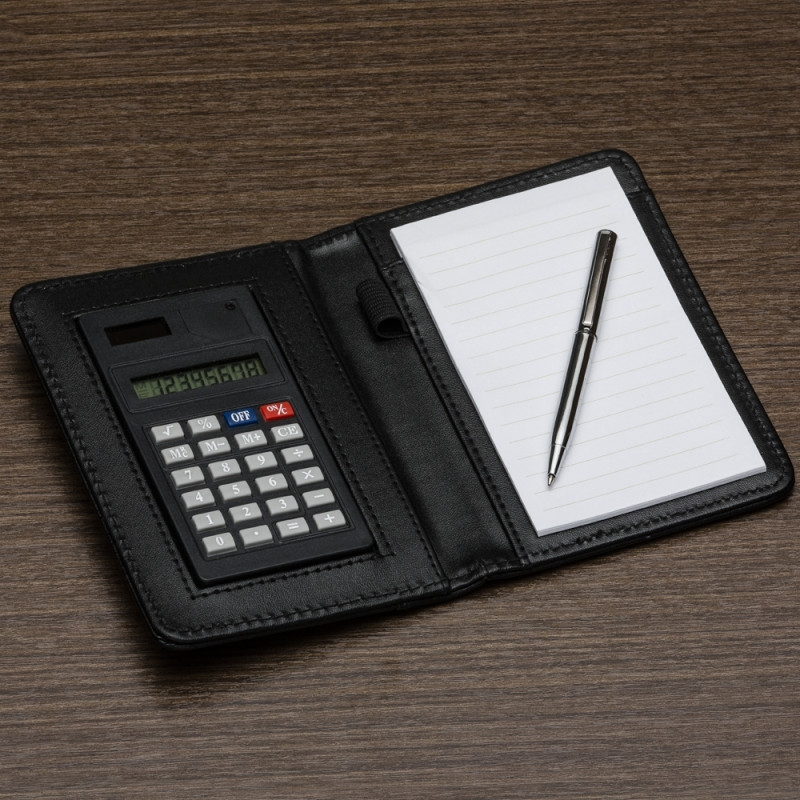 Bloco de anotações com calculadora solar plástica de 8 dígitos e suporte de nylon para caneta, acompanha mini caneta plástica com carga azul e acionamento por rotação.