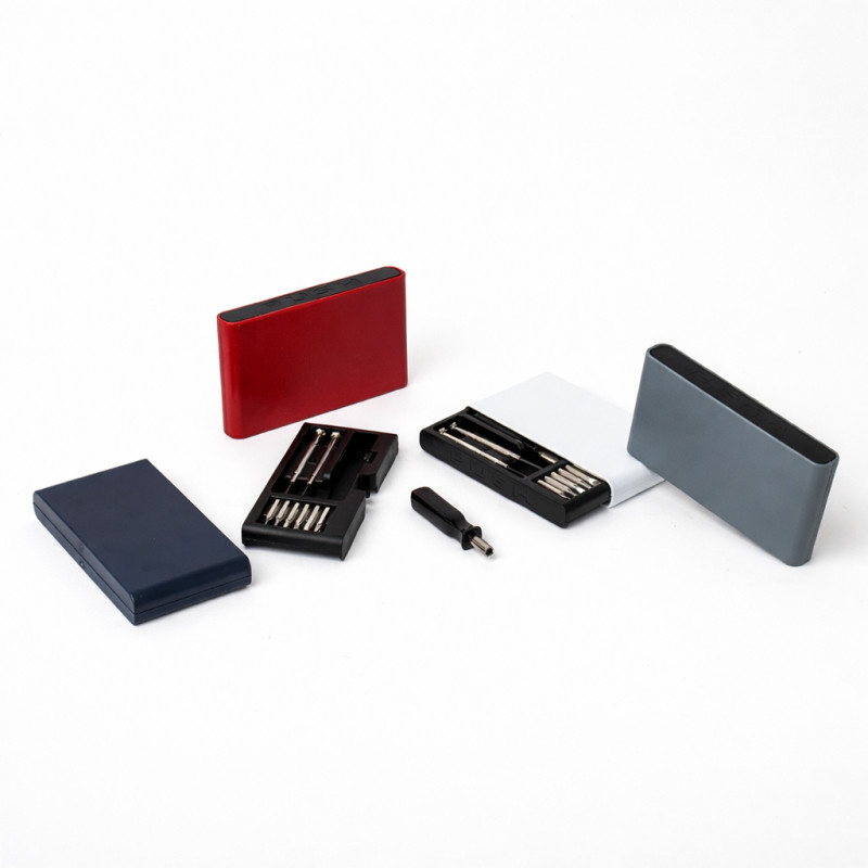 Kit ferramenta com 9 peças em estojo plástico com botão de acionamento. Contém: 1 chave extensora rotatória para conexão das ponteiras, 3 ponteiras Phillips, 3 ponteiras fenda, 1 chave Phillips, 1 chave de fenda.