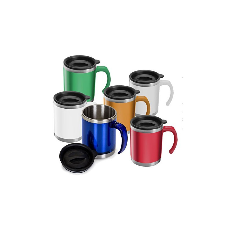 Caneca acrílica 400ml com detalhe oval no pegador, revestimento interno e detalhes em inox. Tampa plástica resistente com sistema giratório para abertura(não é térmica).