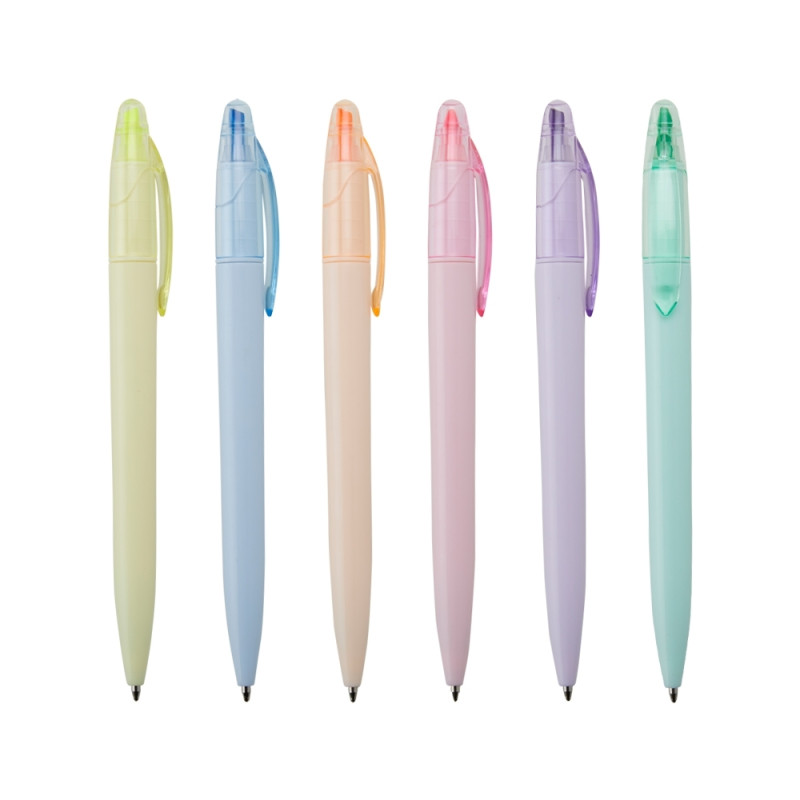 Caneta plástica com marca texto com tampa protetora para o marca texto, carga esferográfica azul 1.0mm e acionamento por rotação.